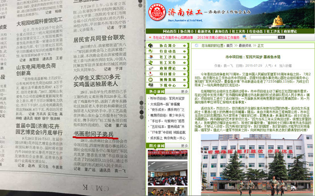 紀念抗日戰(zhàn)爭勝利70周年暨中國人民解放軍建軍88周年來臨之際,濟南市市政工程有限公司團委的青年志愿者們與市中區(qū)社工組織一起來到軍區(qū)某部隊開展了一次“擁軍慶祝進軍營揮毫潑墨獻深情”的曲藝、書法交流慰問活動。